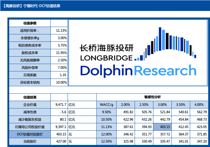 DCF估值得到股价结果403元。在以上基本面数据假设的基础上,长桥海豚君给予了综合11.13%的WACC,3%的永续增长,计算得到公司总体估值9397亿元,每股股价403元,相比5月20日收盘价仍存在6%的折价空间。
