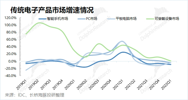 产品创新匮乏,使得传统电子产品市场的需求出现萎缩。从2022年一季度各传统电子市场的表现看,全面呈现不增长或下滑的情况。而原本寄予厚望的可穿戴设备产品在一季度的出货量也陷入了不增长的困境。传统市场逐渐衰弱的情况下,急需要新市场的带动。