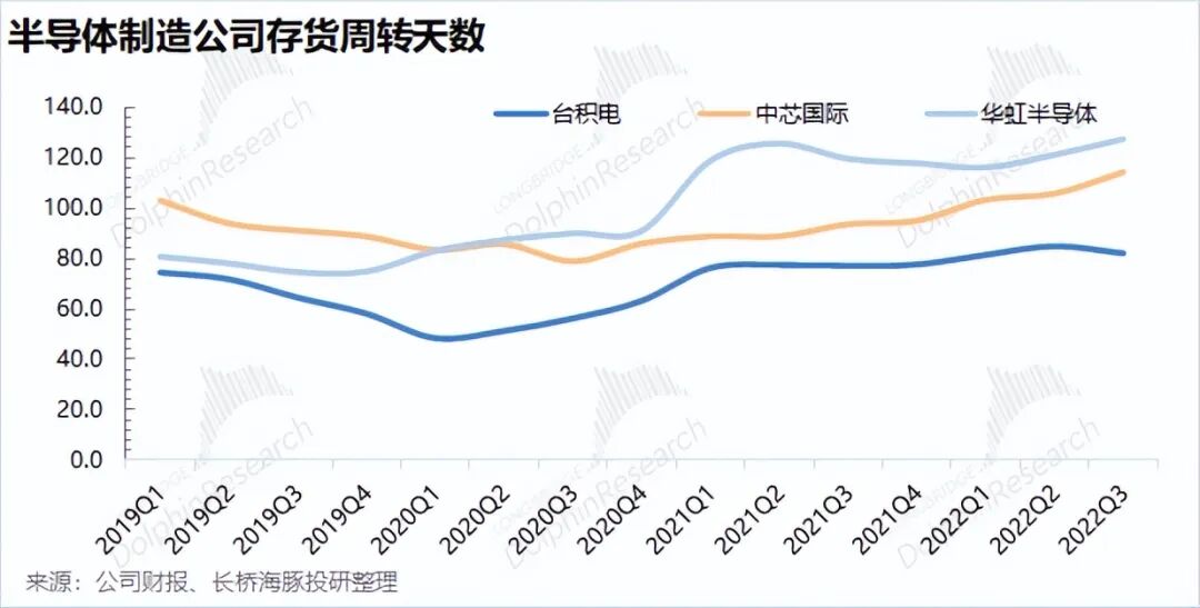 ②存货端:台积电、中芯国际和华虹半导体三家公司的本季度存货周转天数继续走高,从下游反应的库存来看,并没看到明显消化的迹象。从趋势看,三家公司的存货周转天数从2022年二季度开始加速走高。台积电具有自身的特殊性,大客户新品发布有一定的消化作用。