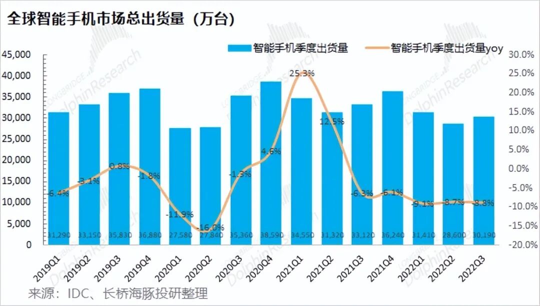 无独有偶,在最新的三季度中全球智能手机的出货量也仅有3亿台,同比下滑8.8%。受疫情等不稳定因素和产品创新不足的影响,消费者减少了对手机的购买。而手机作为半导体行业一个重要的下游,需求疲软也促使半导体进入下行周期。