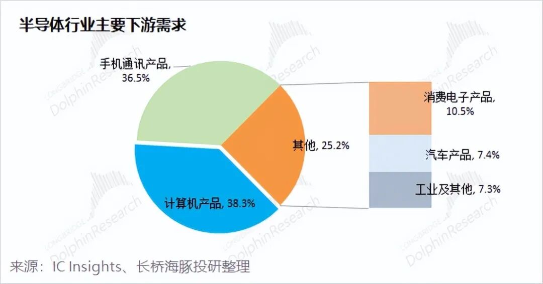 因此本轮半导体周期下行,主要是由下游电子产品需求不足导致的。从IC Insights的数据看,计算机产品和手机通讯产品是半导体行业的最大下游,占到整体需求的70%以上。因为半导体行业的景气度,与这两个下游息息相关。