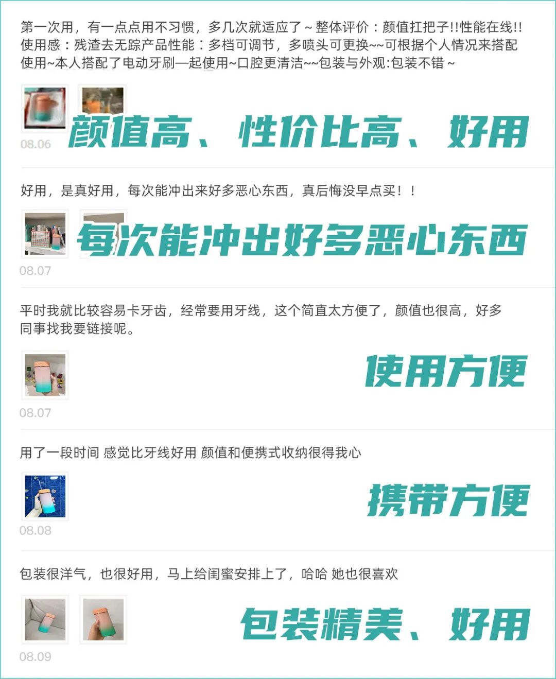 我还采访了CC同学,她说:“yi生推荐用,后面用着用着就戒不掉了,本来戴牙箍就容易卡食物,以前刷牙刷半天,现在每天冲牙器1分钟搞定,贼爽~”