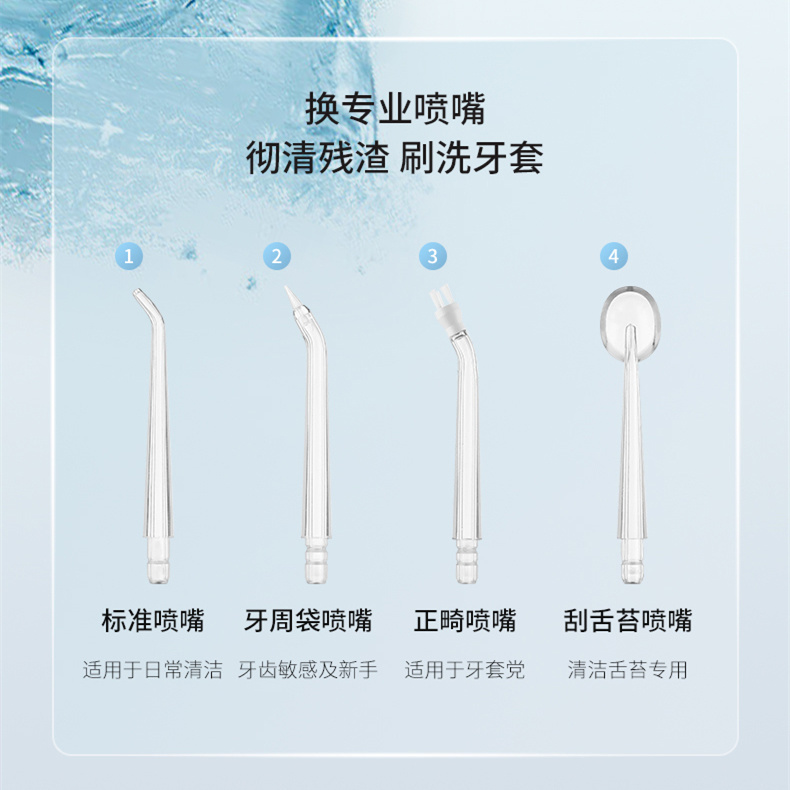 轻柔模式:水流柔和,适合口腔脆弱和初次使用人群。
