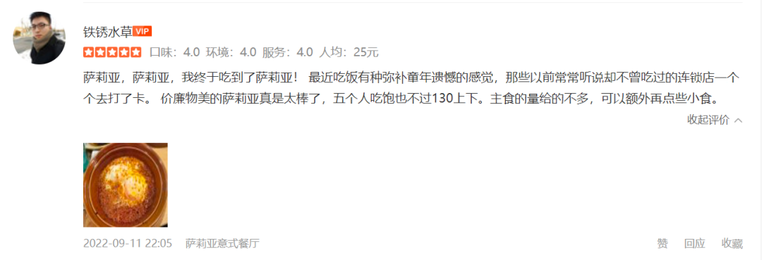 疫情下大部分连锁餐企生存艰辛,它却逆势增长,总公司年营收超84亿元人民币,利润翻了4倍!它主要开在北上广等一线城市,客单却只要35元,靠“极致性价比”开出了400多家直营店!而且,商场餐厅换了一茬又一茬,它却在商场悍然不动,开了十几年的老店不在少数,生命力超强!它就是被称为“中国最土西餐厅”、“意大利沙县小吃”的萨莉亚!萨莉亚虽然是家意式餐厅,其实它是家日本企业,成立于1973年,已经有49年历史,已于1999年上市,在亚洲拥有1500多家门店,全部直营。2003年12月进军中国市场,在上海市天钥桥路开出首店,目前在中国有400+多家门店,依旧全部直营。萨莉亚被称为“意大利的沙县小吃”,物美价廉是它最大的标签。在一碗面、一杯奶茶都要30元+的一线城市,萨莉亚的人均却只要35元,可能是很多人有底气把菜单都点一遍的西餐厅。烤饭14元/份、意面16元/份、九寸披萨25元/份……8块钱的饮料畅饮,可乐雪碧咖啡,随便续。如果想提升下格调,9块钱就能喝到一杯赤霞珠干红葡萄酒。有人说在这:“20块钱能吃饱,30块钱能吃好,40块钱基本上就得吃到扶墙出。”价格低廉,产品丰富。萨莉亚的菜单上有沙拉、披萨、意面、甜点、浓汤、饭类、焗类、葡萄酒、饮料等11大品类,100道左右的产品。难能可贵的是,它几乎十几年来价格都没有太大的变化。据萨莉亚统计,在2022财年的Q2每位客人消费的金额达到了最高,折合人民币为37.1元,其中日本客单略微高一点,为38.45元人民币;国际市场,主要是中国客单为34.6元。在点评网站看了看评论,价格不是萨莉亚唯一的优势,百分之八十的消费者,就是冲着萨莉亚的味道去的:“蒜香焗蜗牛绝绝子”、“闭着眼睛点都不会出错”……“不爱的请你绕道,您追求高档次高消费就别来这家开在魔都这么久都经久不衰的老店。”还有顾客总结:“比萨莉亚便宜的没它好吃,比它好吃的价格又很贵,同档位,萨莉亚完胜。”萨莉亚被称为是学生党的天堂,小学生中学生、大学生都有;刚毕业不久,手头拮据的打工人们也在这里得到了美食的慰藉。更值得关注的是,好吃又便宜让萨莉亚门店有着超强生命力。在美团平台上可以看到,萨莉亚在上海、北京、广州的门店,开了七八年的比比皆是,收录了十几年的也不少。这在餐厅平均寿命只有508天的餐饮业、商场餐饮每隔三四年基本要换一茬的大背景下,屹立不倒的萨莉亚显得格外难得。3、年营收超过84亿元,深耕中国三大区开近400家直营店菜品价格低,品质又还不错,而且萨莉亚只做外带,不做外卖。那它能赚钱吗?答案是,它不仅赚钱,利润还在疫情下增长了4倍。根据日经中文网报道,萨莉亚最近发布的数据显示,2022财年(截至2022年8月)的营收将增长19%,达到1500亿日元(约合人民币84.4亿元),合并净利润预计将增长4倍至86亿日元(约合人民币4.84亿元)。远远高于疫情前的2019财年,增加了超过36亿日元(约合人民币1.73亿元)。萨莉亚目前在中国内地市场主要是由三家分公司来主管三大片区:2003年,成立上海萨莉亚;2007年的时候,成立广州萨莉亚;2008年成立北京萨莉亚。上财年业绩这些区都有不同程度的增长:以上海为中心的市场最大,营收为3.65亿元,同比增长17.8%,广州及北京为中心的市场,营收分别为2.84亿元和1.44亿元,增长幅度达到28.7%和20.1%。在截至2月底的过去6个月中,萨莉亚在国际市场的拓展基本上是集中于中国市场,在上海新开了10家门店,广州新开13家,北京新开了4家,香港新开了3家。截至2月底,上海的门店有152家、广州有136家、北京有85家、香港有57家。