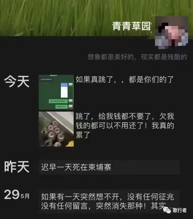 7月1日凌晨,中国女子青青在西港跳楼身亡。一名女子以如此决绝的方式离开人世,引发了其好友及在柬同胞强烈的关注。之后,当日凌晨她还一直跟自媒体人阿龙联系,阿龙一直安抚和劝说青青,但沟通了两个小时都没有用,凌晨3点阿龙接到消息,青青已经从27楼跳到3楼身亡。这句遗言是说给她的前男友的,据青青跟阿龙之前所说,该男子有老婆孩子,但青青表示自己不在乎,现在该男子要去泰国找他的老婆孩子,青青无法接受因而想寻求短见。此前,青青也曾给好友发过割腕自杀的视频,场面非常血腥。