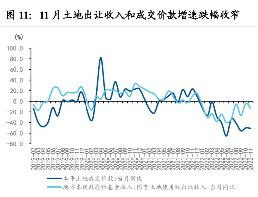 国有土地使用权出让收入和土地成交价款跌幅扩大,百城土地成交面积回落。11月国有土地使用权出让收入同比下跌13.4%,跌幅较10月扩大9.6个百分点;11月土地成交价款同比下降50.8%,较上月跌幅扩大1.0个百分点;同时11月100个大中城市土地成交面积同比增速回落至25.6%。地产市场低迷仍将继续拖累政府性基金收入。