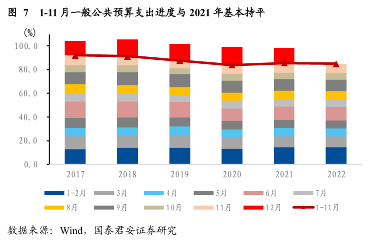 11月一般公共预算支出增速有所回落,前11个月进度大致赶上2021年。11月一般公共预算支出同比增长4.8%,比上月降低3.9个百分点;1-11月支出完成预算85.1%,基本持平2021年(85.5%),参考2021年难以完成全年目标。
