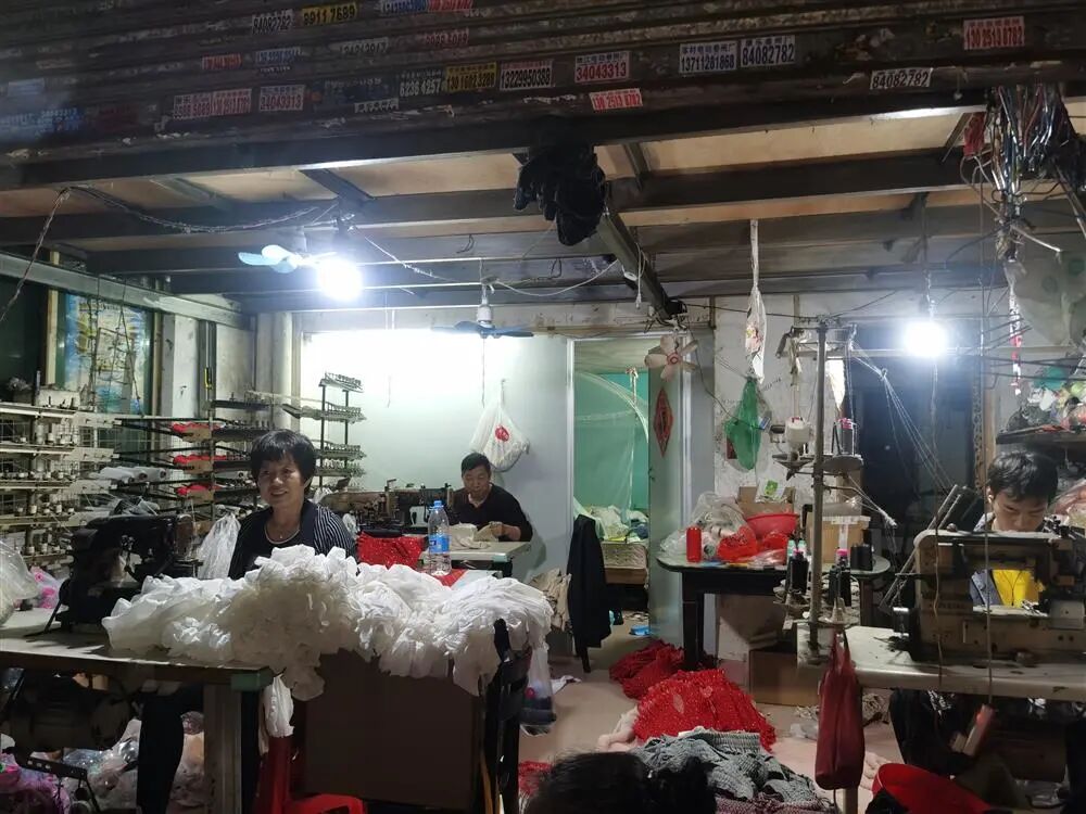 而紧邻中大布匹市场的五凤村、康乐村和鹭江村,则因城中村低廉的房租和城市管理的空白,吸引了大量外来务工者,并发展出一条完整的制衣产业链——客户前脚在布匹市场订购面料,后脚就到制衣村里的工厂下单,裁剪、缝制、熨烫、印花、贴钻,快则当日就能完工,慢也不过三五天工时。服装出厂后,经由十三行、沙河等批发市场,销往全国各地。