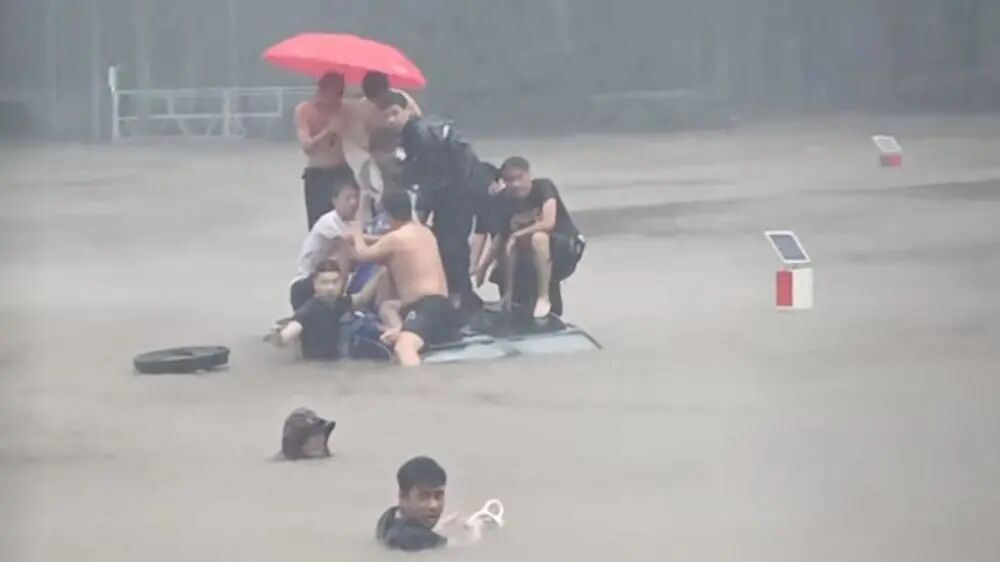 7月下旬,一场罕见的特大暴雨席卷郑州,引发全国关注。7月23日上午,一段不到2分钟的视频在多个短视频平台转发:大雨中,一辆黑色SUV车被困路中,就在洪水快要没过车顶、千钧一发之际,众人向汽车游去,大家爬上车顶,砸破车窗,救出祖孙三人,并用水桶将孩子成功运送到了安全地带。