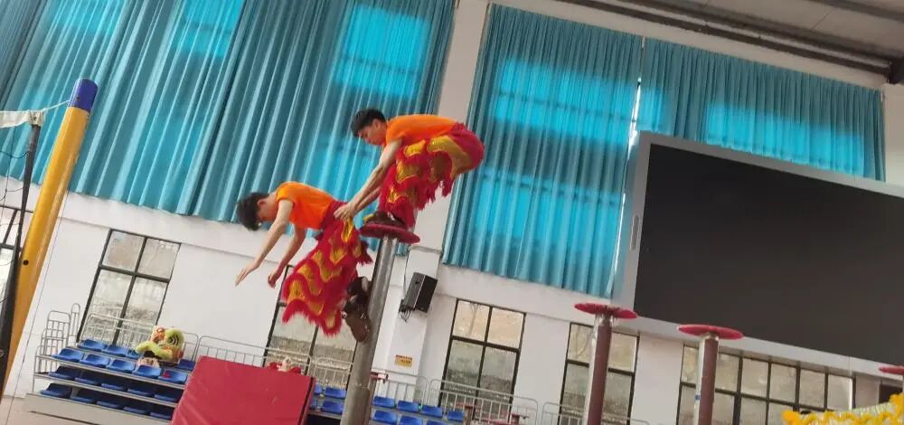 这不是失误,只是一个舞狮套路。狮尾马泽锦要吊在狮头祝文康身上,模拟出狮子嬉戏的状态。郑子愚摄