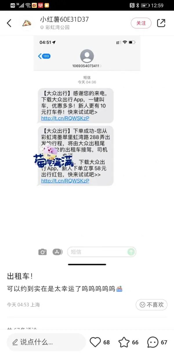 一位离沪者在社交平台上晒出预约到去虹桥出租车的短信截屏。