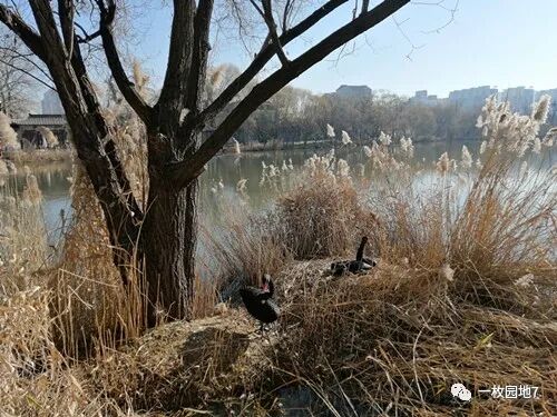 落叶树基本全部落叶了,只有柳树,还挂着许许多多青黄的叶子;常绿树木有松树、柏树、大叶黄杨等。湖水一点都没有冻上,水波反射着太阳的白光。能够看到最多的鸟儿是喜鹊、灰喜鹊和麻雀,它们是北方的留鸟。草地有的地方还特别绿,有的地方已经枯黄了,但都不太茂盛。现在已经能够看到海棠的小芽了,原来每一种树木都有小芽——它们已经为来年的春天做好准备了!