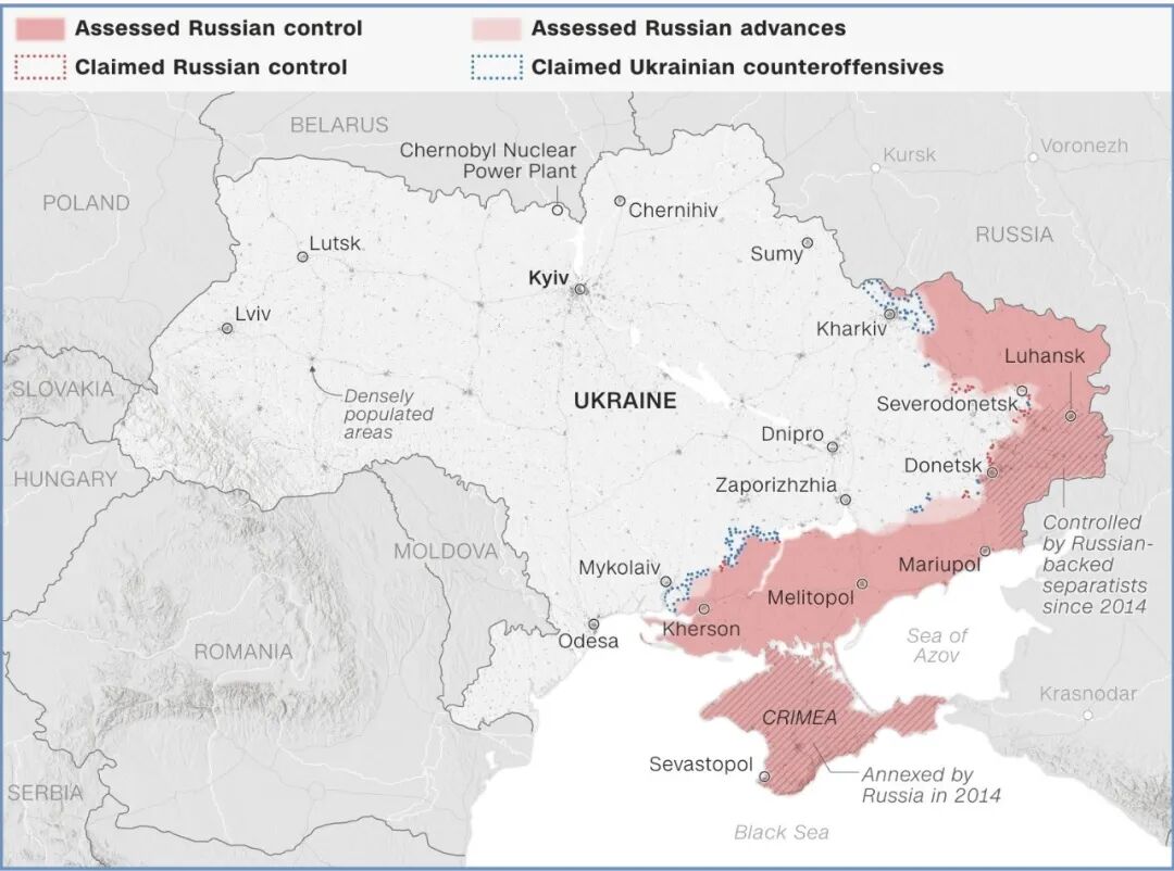 乌克兰战场态势图(粉色区域为俄军占领区)