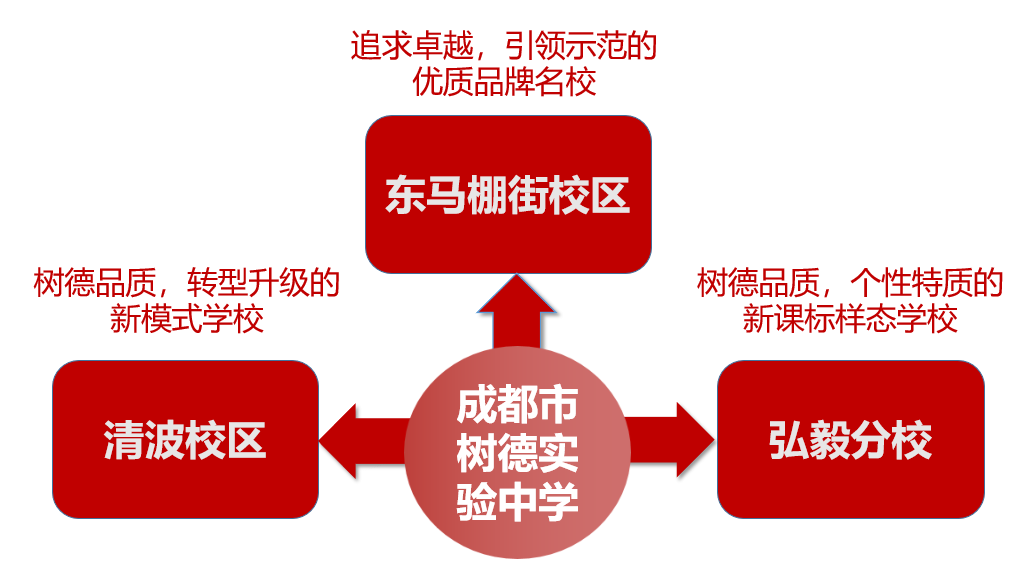 什么是“一校三区”?即本部东马棚校区、清波校区与弘毅校区,均是树德实验的“亲儿子”,三所学校将进行统一人事、统一管理、统一教学、统一考试、统一评价。