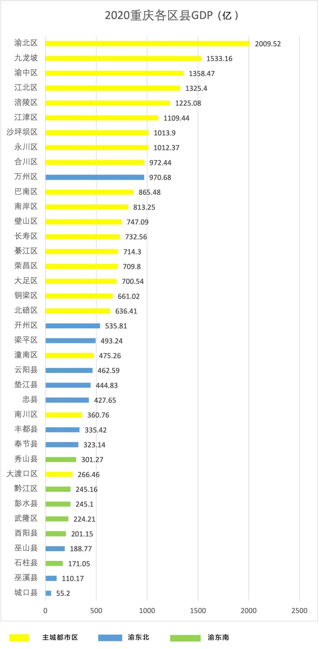根据统计,2020年重庆GDP前19的区县有18个在主城都市区,而万州区作为渝东北三峡库区城镇群的中心城市仅为第十。GDP排名第一的渝北区2009.52亿元,是最低城口县55.2亿元的36倍。![]()