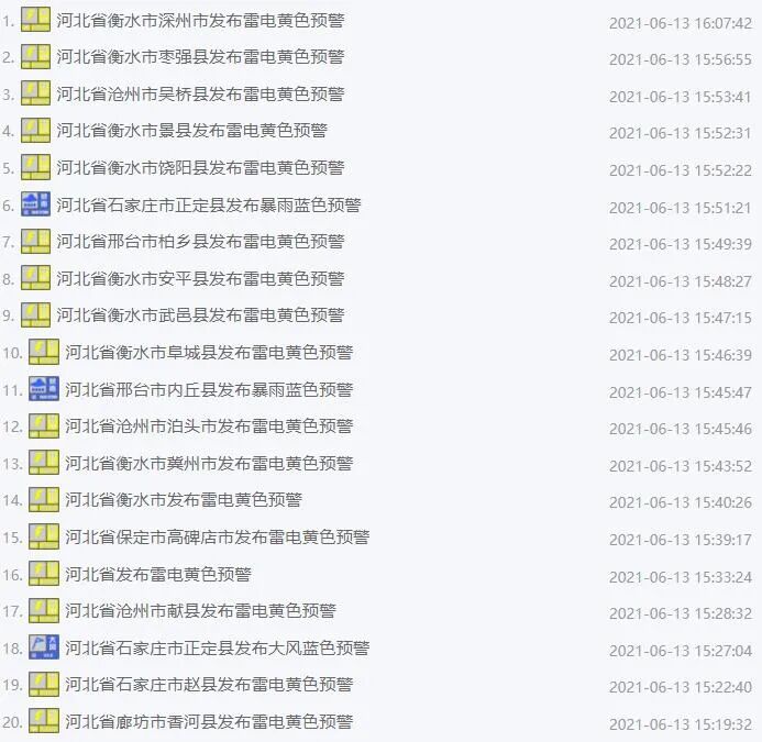 衡水市气象台2021年06月13日15时34分发布雷电黄色预警信号:预计未来6小时内衡水(桃城区,高新区,滨湖新区,枣强县,武邑县,武强县,饶阳县,安平县,故城县,景县,阜城县,冀州区,深州市)有雷雨天气,雷雨时局地伴有短时大风、短时强降水等强对流天气,请有关单位和人员做好防范准备。