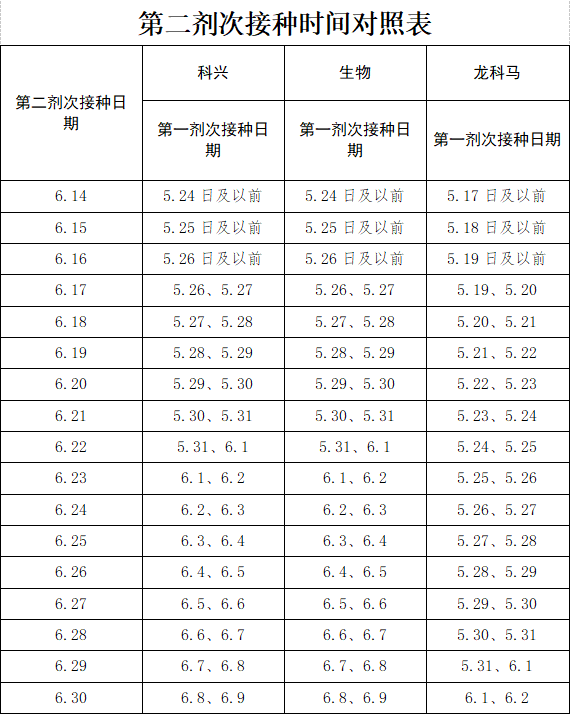 6月18日后,符合接种第二剂次条件的居民务必在间隔期满当日及次日进行接种。具体接种时间参见附件。