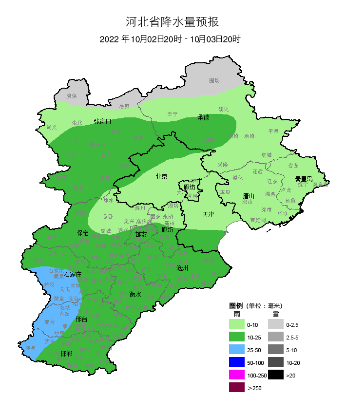 2日夜间到3日,全省阴,中南部地区有小到中雨,其他地区有小雨,局地有大雨,其中坝上地区有小雨转小雪。