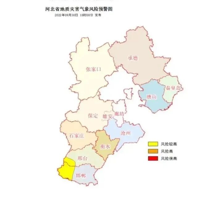 自9月30日20时至10月1日20时,邢台市(沙河市、信都区)、邯郸市(武安市、涉县、磁县、峰峰矿区、永年区)发生崩塌、滑坡、泥石流等地质灾害风险较高(黄色预警)。上述地区有关责任单位和监测人员要做好地质灾害监测、巡查、转移避险等防范工作。