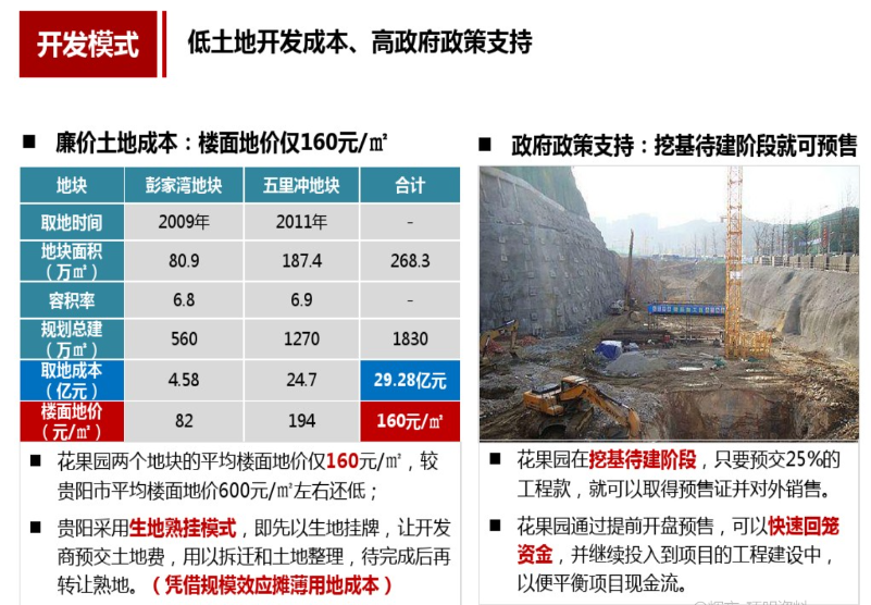 高楼迷的照片,花果园前身的棚户区,和下图对比一下:这是近十年来城市发展的基本套路,改造棚户区,建新城,拉动房地产,吸引人口。但是这面临着和其他城市一样的问题:老城区改造太难,造新城资金也不够,况且亿贵州人的人均收入水平,造出的新城有没有人接盘也是摆在眼前的问题。所以,当地没钱只能给政策,一股脑全都打包给了本地开发商,包括一级土地开发权。花果园楼盘的地价只有160块,生地直接低价出让了,本来七通一平这些政府来做的事情都让开发商包了。