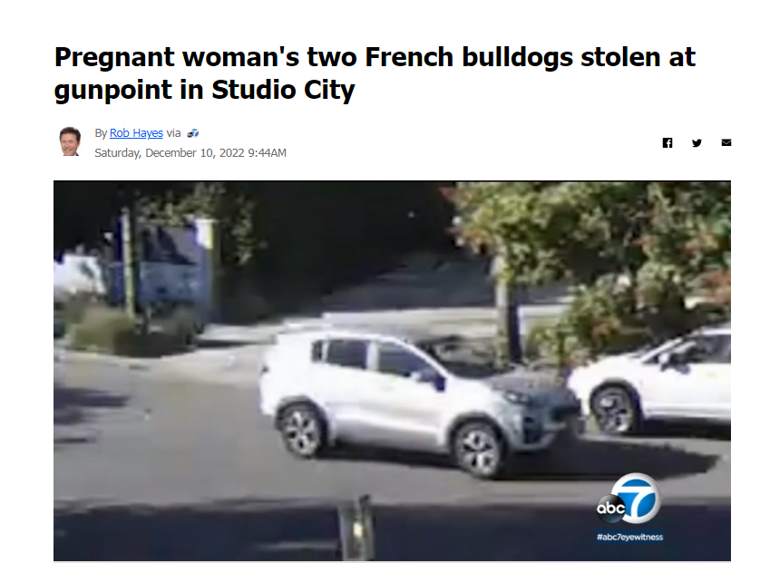 据ABC新闻12月9日报道 据洛杉矶警方称,周五早上,一名怀孕9个月的妇女在斯蒂迪奥城(Studio City)外出散步时遭遇武装抢劫,她的两只法国斗牛犬在枪口下被抢。
