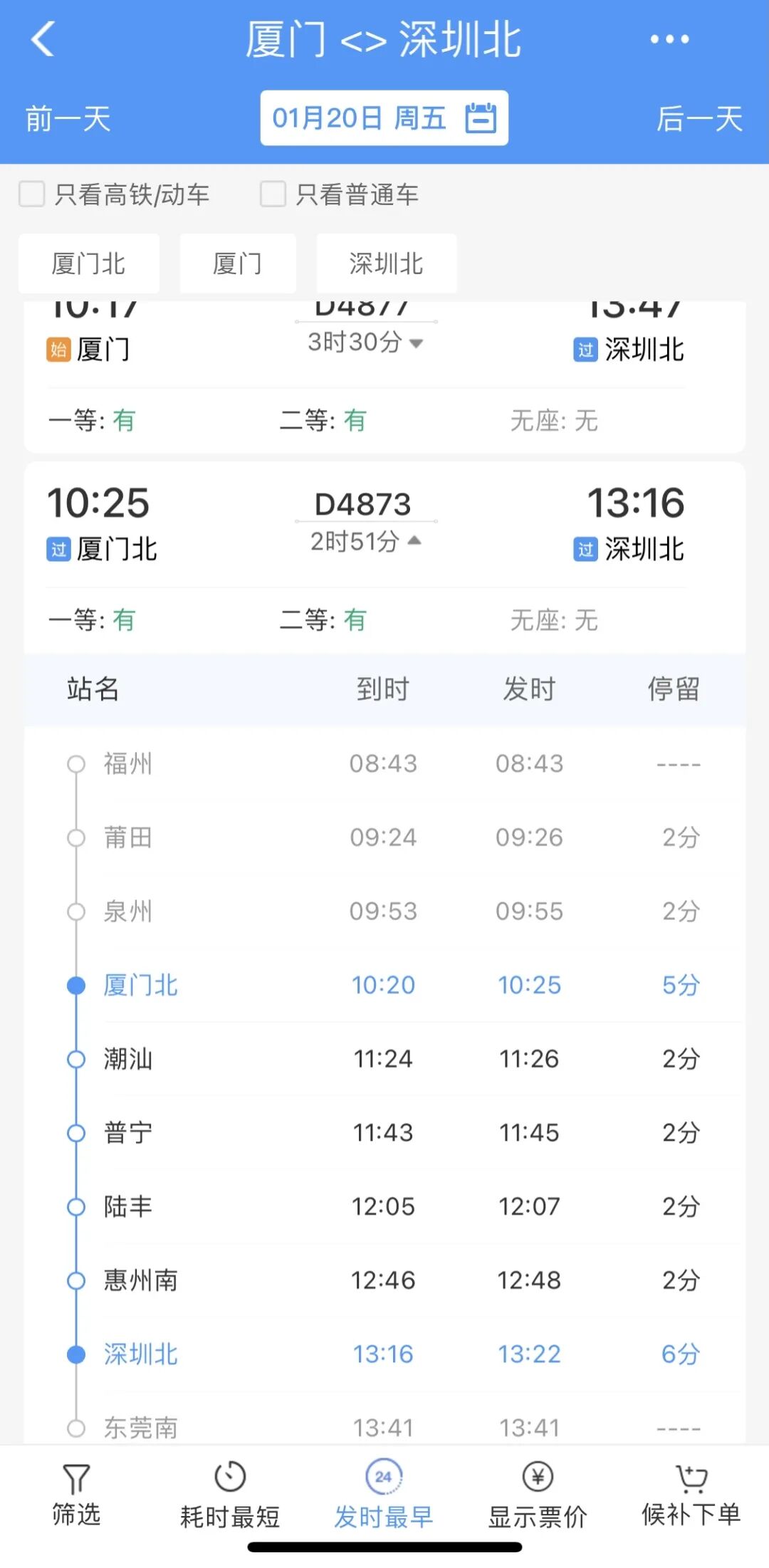 此外,通通还发现,除了上述G3001/2次变身为D4873/6 D4871/4次以外,还有原厦门-香港西九龙G3003/4次变身为厦门-惠州北D4877/6 D4875/8次,香港西九龙-厦门G3005/6次变身为深圳北-厦门D4926/5次,G3007/8次变身为河源东-厦门D4923/2 D4921/4次。由于今天开始12306已经预售除夕的车票,这些进港列车预计春节前都暂时不会恢复开行了。