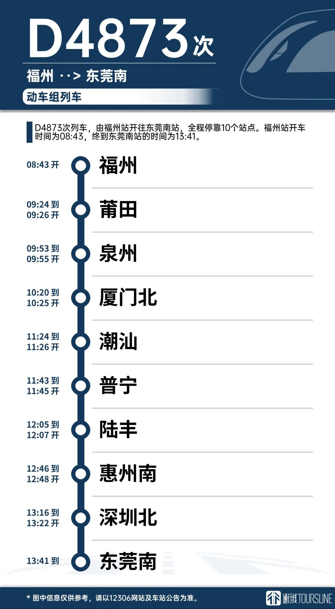 铁路相关渠道显示,近期福州—东莞南间开行D4873/6 D4871/4次动车组列车。通通乍一看这停站和时刻,第一眼就感觉很熟悉。定睛一看,这不是福州—香港西九龙G3001/2次的时刻吗?本次开行的D4873/6和D4871/4次动车组列车在福州—深圳北间套用了G3001/2次列车的运行线,只不过到了深圳北之后往反方向开去了东莞南始发终到。