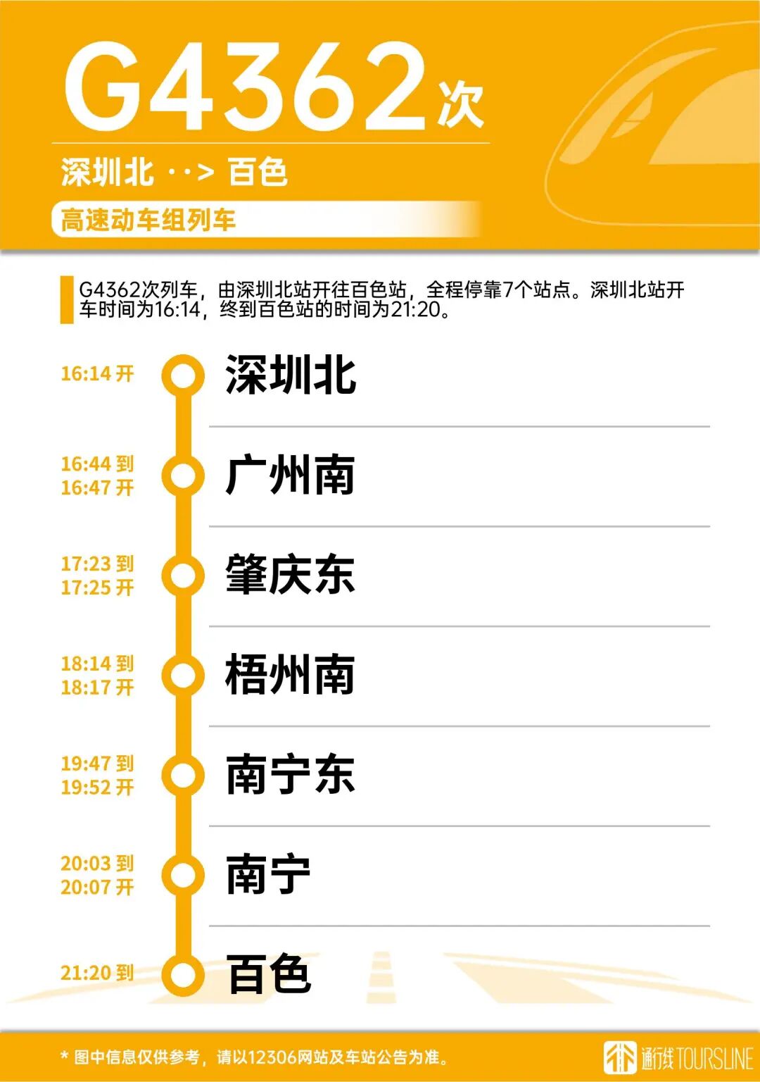 铁路相关渠道显示,2023年春运运行图调整后,南宁东站—深圳北站G2911/6次延长至百色始发终到,车次调整为G4364/1/2/3次。这是百色站首次开行“G”车,该车的开行将方便在大湾区生活工作的百色小伙伴返乡。上述列车的运行时刻及办客站详见附图,附图信息仅供参考,请以12306网站及车站公告为准。