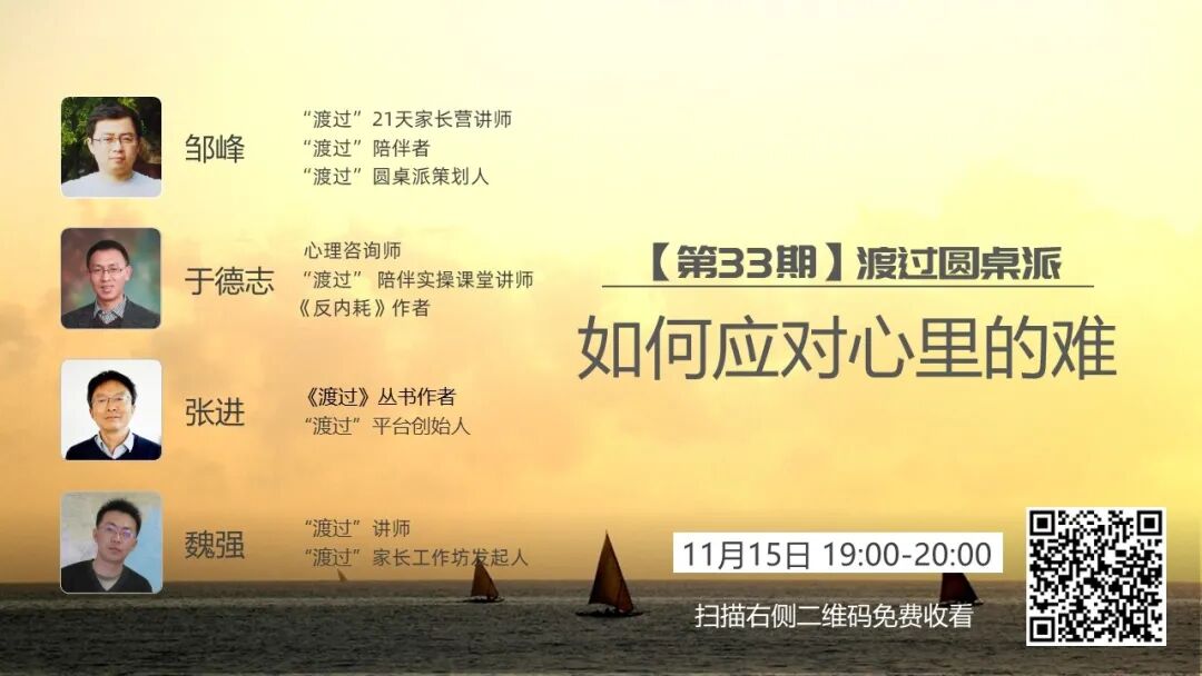 往期圆桌派目录:点击标题收看往期内容精华第一期:孩子自伤的背后第二期:解开青少年心理健康的谜团第三期:完美主义和强迫第四期:亲子对话 | 母女各自的成长第五期:抑郁症的成因和疗愈第六期:肩负使命,让改变发生第七期:聊聊住院那些事(文字精华)第八期:聊聊边缘人格第九期:社会支持和抑郁康复(文字精华)第十期:云端修仙的少年派(文字精华)第十一期:做心理咨询是一种什么样的体验第十二期:孩子,把手给爸爸(文字精华)第十三期:难治性抑郁 VS 抑郁症(文字精华)第十四期:聊聊复学那些事儿(文字精华)第十五期:创伤的心理干预第十六期:抑郁焦虑背后是无助第十七期:宠物的陪伴和疗愈(文字精华)第十八期:创伤和催眠疗愈 (文字精华)第十九期:妈妈请你这样陪伴我(文字精华)第二十期:孩子为啥不想去学校(文字精华)第二十一期:孩子自己谈复学第二十二期:我这一年的变化(文字精华)第二十三期:返校后的人际关系第二十四期:道理如何得到身体的佐证第二十五期:回校遇到困难怎么办?第二十六期:抑郁的多元疗愈手段第二十七期:我为什么不想去学校第二十八期:复学之路——爸爸的力量第二十九期:病耻感与心理康复第三十期:我不上学了,妈妈你还爱我吗?第三十一期:青少年如何缓解焦虑第三十二期:跨性别与性别焦虑扫描下图二维码,收看圆桌派内容合集。扫描下图二维码,购买于德志著《如何应对心里的难》点击“阅读原文”进入直播间