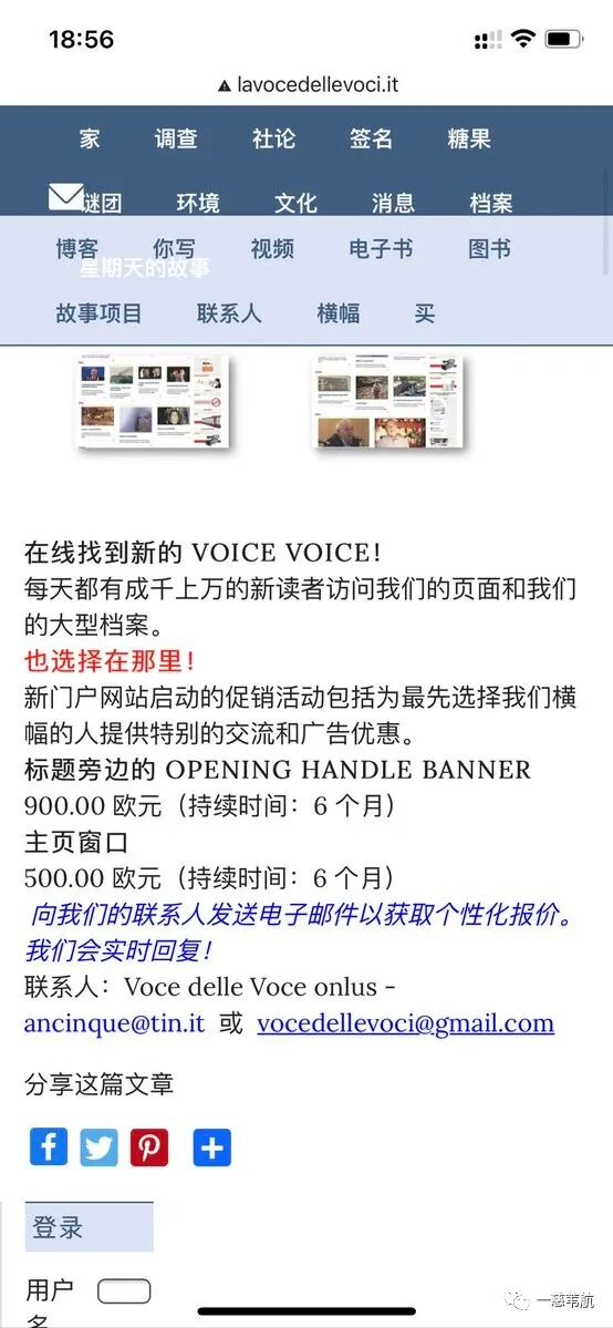 哦,对了,据这个“Voce Delle Voci”网站官方提示,只需500欧元,就可以在首页上方出现为期六个月的你的广告。同样的,他们宣传的官方脸书主页,点赞量为2500+,而同类意大利媒体官方脸书主页点赞量为百万级(脸书公众主页不显示粉丝数,只显示点赞量)。