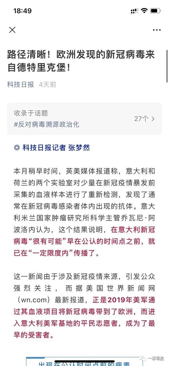 接下来我找到了科技日报的这篇文章《路径清晰!欧洲发现的新冠病毒来自德特里克堡!》。