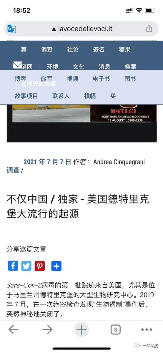 在这篇名为《NON SOLO CINA/ ESCLUSIVO– LA PISTA AMERICANA DI FORT DETRICK PER L'ORIGINE DELLA PANDEMIA》(中文翻译:美国德特里克堡大流行的起源)的意大利语文章中(作者:Andrea Cinquegrani),反复提到了我搜索的关键词。