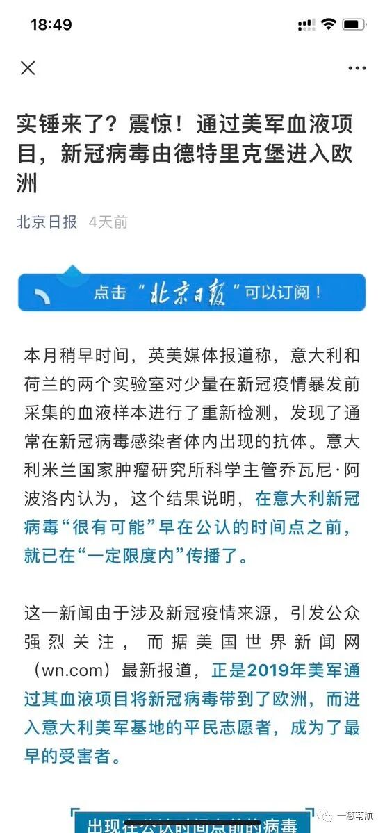 首先找到了北京日报的这篇文章,题目为《实锤来了?震惊!通过美军血液项目,新冠病毒由德特里克堡进入欧洲》。这篇文章的题目与网上流行的那篇的题目非常相似,内容基本一模一样。想必编辑转载的时候,仅是对细节进行了改动。