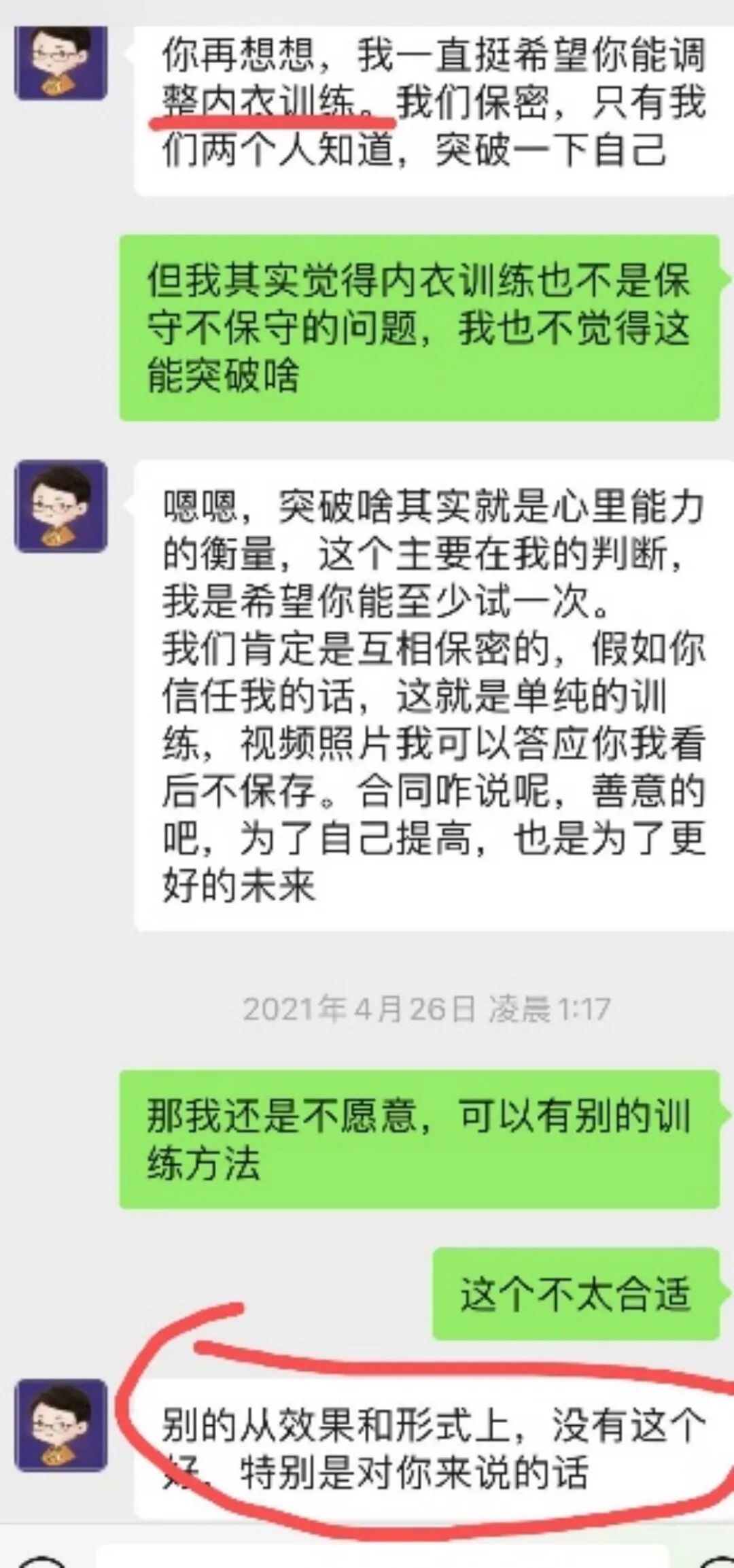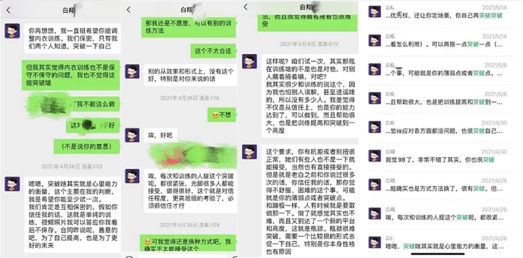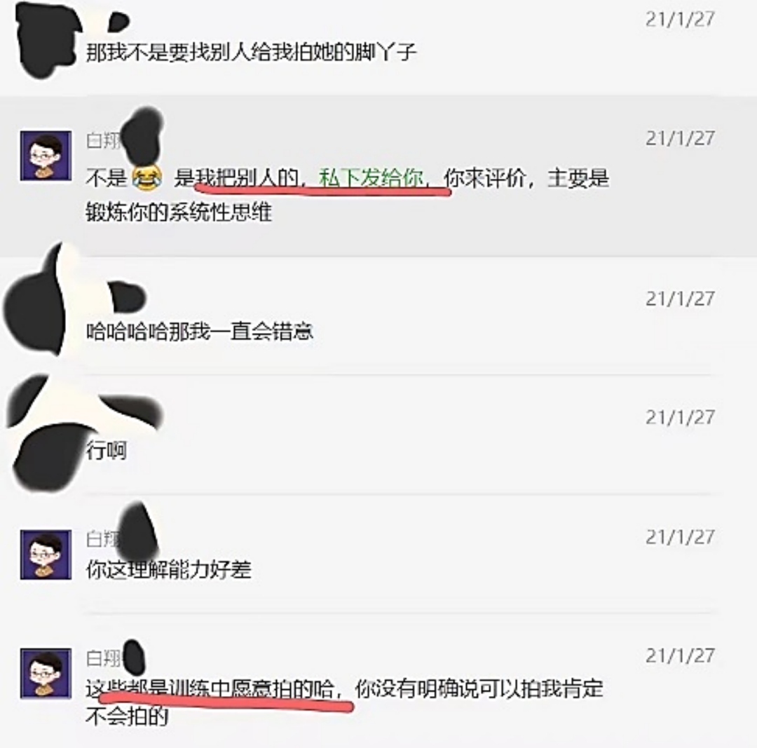 当天吃完饭已是晚上十点多,但白翔*仍坚持要跟我回酒店房间进行所谓的面试辅导,我虽有所防备且不情愿,但碍于师生情面和对他信任还是答应了。在回酒店的路上,白翔*对我说为了避免不必要的误会不要把这个事告诉别人,但我还是偷偷告诉了我朋友要隔10分钟给我打一个电话以确保我安全。辅导期间他以帮助我克服面试时的紧张感为由,要求我光脚站在地板上、跪在甚至趴在椅子上进行自我介绍和回答问题。此外他还以帮助我克服“镜头恐惧感”为由全程对我举着手机,但承诺不进行任何拍摄(事后证实其在训练期间不断进行偷拍)。训练持续到接近凌晨两点,白翔*才离开房间。次日,由于前一天的晚上休息不足和被他不停打击的缘故,面试理所当然以失败告终。在其诱导下,他让我更觉得自己真的能力不足需要提高。深圳一别后的一两个月内,白翔*不断向我灌输面试辅导的必要性,并以上次在深圳“光脚训练”表现不好为由,诱导我更进一步地在户外光脚走路,并拍摄视频发送给他检查。此时,我对这一训练已经出现明显的反感和抵触,碍于此前多年的师生情分,我委婉地找了很多理由进行推辞。在诱导无果之后,白翔*开始增强PUA的强度,以缺乏训练主动性、不求上进等理由反复对我进行打压。后来我迫于无奈和出于对老师的尊敬,最终按照他的诱导出门光脚走路并拍摄了视频。期间由于不断承受着被PUA的精神压力,我对我个人能力和发展前景产生了前所未有的不确定性和困惑迷惘,甚至曾三次前往学校的心理咨询室,被诊断为中度抑郁症状,并签了不自杀协议书。在对我的PUA初见成效之后,白翔*又跟我提及所谓的“系统性思维和评价体系训练” ,用来帮助我构建系统性的话语逻辑思维和对事物的评价体系。他首先让我对自己的外貌进行评价打分。随后,他给我发了其它女同学的照片,让我对别人的身材长相和脚进行评价。这一期间他总共给我发了包括我在内的15个女生的上百张照片(大部分是足照,也有很多正脸照和只穿了内衣内裤的照片)。当我对此表现出抵触时,他跟我再三表明,这些照片是征得别人同意拍摄并且发给我的。当我仍然表示怀疑时,他利用曾经的辅导员身份以及对他人隐私要保密的理由再次对我进行PUA,并施压逼迫我对所有人保密此事。2021年3月,我因心理压力过大计划回家休养一段时间(此时尚未意识到自己已被PUA控制),而白翔*则以自己即将外派非洲并仍希望跟我面对面训练一次帮我提升为由,劝说我前往深圳为其送行。在他的再三洗脑下和对老师的尊敬,我内心竟感激地认为遇到这么关心自己的老师实在是我的幸运,于是我答应了他的请求,又一次独身前往深圳。我本是要自己定住宿的地方,但白翔*以不方便训练为由坚持要求帮我定了x公司员工公寓,并让我去他的房间里训练到凌晨三四点,期间仍以增强抗压能力为由等虚假借口对我进行偷拍。回到学校后,白翔*除了继续要求我拍摄光脚走路视频外,还提出了另一种突破自我的训练,这种训练则是内衣训练。内衣训练即在之前的光脚训练之上只穿内衣内裤,言称可以用极端的方式帮助我的能力能进一步突破。我再三地明确拒绝后,白翔*依旧向我发送了其他受害者所谓内衣训练的照片,藉此以博求我的信任和同意。甚至在我拒绝他的次日,白翔*主动向我提起可为我提供顶级投行的实习机会。我当时起了疑心,感觉他像是为了说服我进行内衣训练而给我提供 “好处”,于是以疫情和时间不够的借口拒绝他的“好意”。一周后,他再次试图说服了接受内衣训练,甚至妄图洗脑我不接受这种训练方式是对他的不够信任,最终仍然被我拒绝,但仍有其他女生深受其害。(由于这些照片涉及隐私,便不在此公开,但已向警方展示)我拒绝“内衣训练”后,他又提出了所谓的“场景想象训练”,言称他是经过了反复思考觉得这个可以作为内衣训练的一种补充形式并对我很有帮助。由于他步步紧逼且因其师长身份,我当时天真的以为他是出于好意,于是不好意思再度拒绝。此训练即由白翔*扮演某女生,而我则需要想象并描绘出我与她从见面,到争吵,到对打的全过程。模拟对话结束后他以打分反馈的形式,来给我施加正向和负向激励,让我一步步突破自己底线。从想象我们光脚打架,到想象只穿内衣内裤打架,到全裸对打……在对话中,除了要求我要“战胜”该女生外,他一直在刻意引导对话向色情方向发展,比如提到揉捏女生胸部,抚摸私密处等字眼。而这些荒唐的行为,都被他冠之以“用非常规方式来帮助我快速突破性格瓶颈,培养我的进取心和竞争力”的美名。从2021年三四月起至今,白翔*就对我进行了近10次这种训练,后来我从其他受害者处了解到,白翔*有足癖,他通过诱导女学生拍摄相关视频和言语刺激来供其自慰,根本不是什么提升自我想象力和应变能力的训练。在这个过程里,他为了博得女孩儿的信任,编造了许多荒唐的借口,例如拍照片是为了完成学术论文,如果女生不同意,甚至会搬出指导老师以此施压。许多受害的女孩儿都以为自己是参加学术项目,友情帮忙。但我们在事后向指导老师求证过此事,其实老师对此根本不知情,论文也不过是他的借口,至此,我们才发现完全是白翔*在编造。知道真相的我,害怕、震惊、恶心、愤怒等情绪涌上心头乃至于痛哭流涕……骗局的崩塌最终源自毕业季的一个