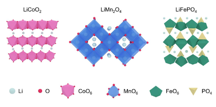 图1 正极材料LiCoO2、LiMn2O4和LiFePO4的晶体结构