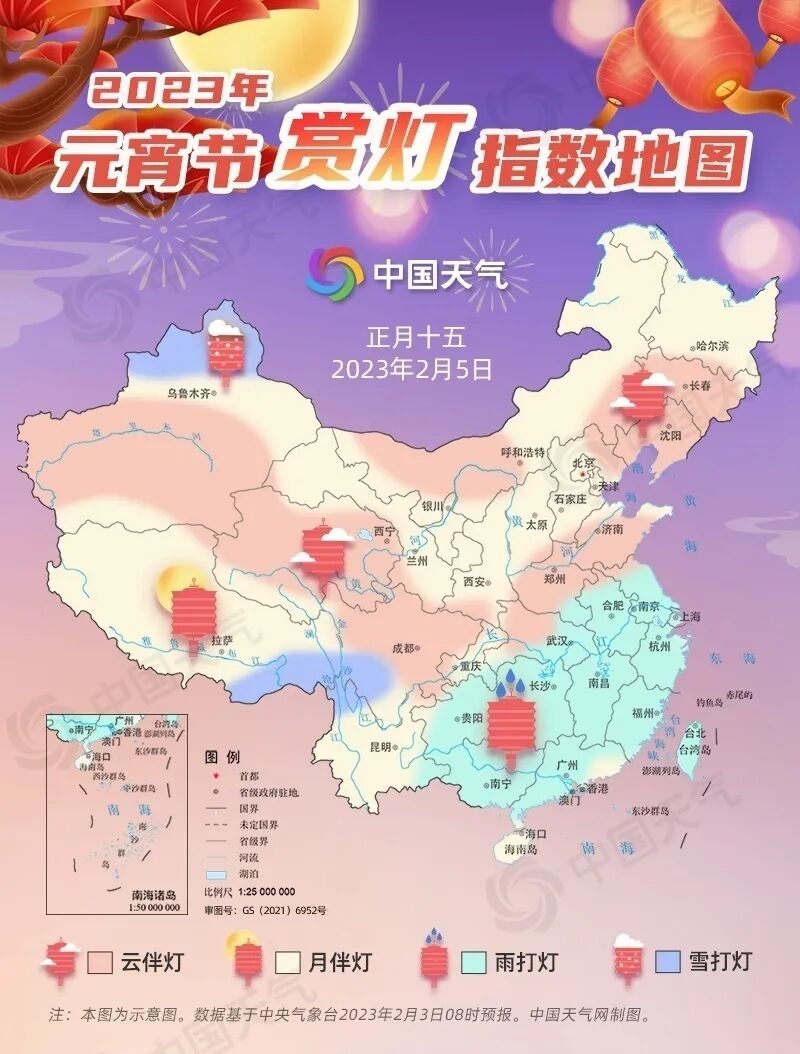 元宵节赏灯地图出炉!今年元宵夜北方大部地区天气晴朗可感受月伴灯的美好,沈阳、郑州等地“云伴灯”更显诗意;南方多地则会雨打灯。在新疆北部、西藏东南部等地可能有雪花现身,当地小伙伴可以感受到飞雪伴花灯的浪漫~