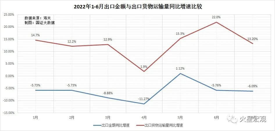 海关公布的2022年1-6月商品出口金额为11.14万亿元,同比增长13.2%。但海关公布的同期货物出口运输量同比下降了6.1%。根据海关的2022年6月出口主要商品量值表推算,1-6月出口商品价格算术平均同比上涨了16.5%。出口金额增长幅度比出口运输量增速乘出口价格涨幅推算的运输金额增速9.4%,高出3.8个百分点。