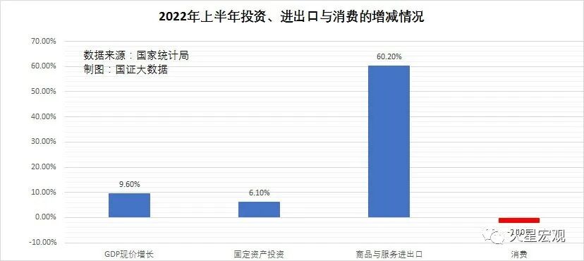 上半年,全国居民消费总额16.58万亿元,同比增长2.5%;商品房销售额6.61万亿元,同比下降28.9%;社会消费品零售总额为21.04万亿元,同比下降0.7%,全国一般公共预算支出12.89万亿元,比上年同期增长5.9%。上半年的最终消费约为29.75万亿元,同比下降2.1%。对GDP的贡献率为负13%。