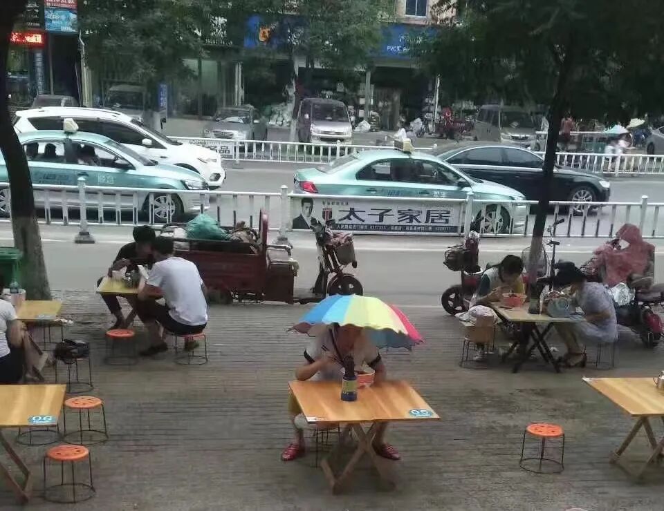 早期摆摊时期,天空突降小雨,顾客打伞就餐。