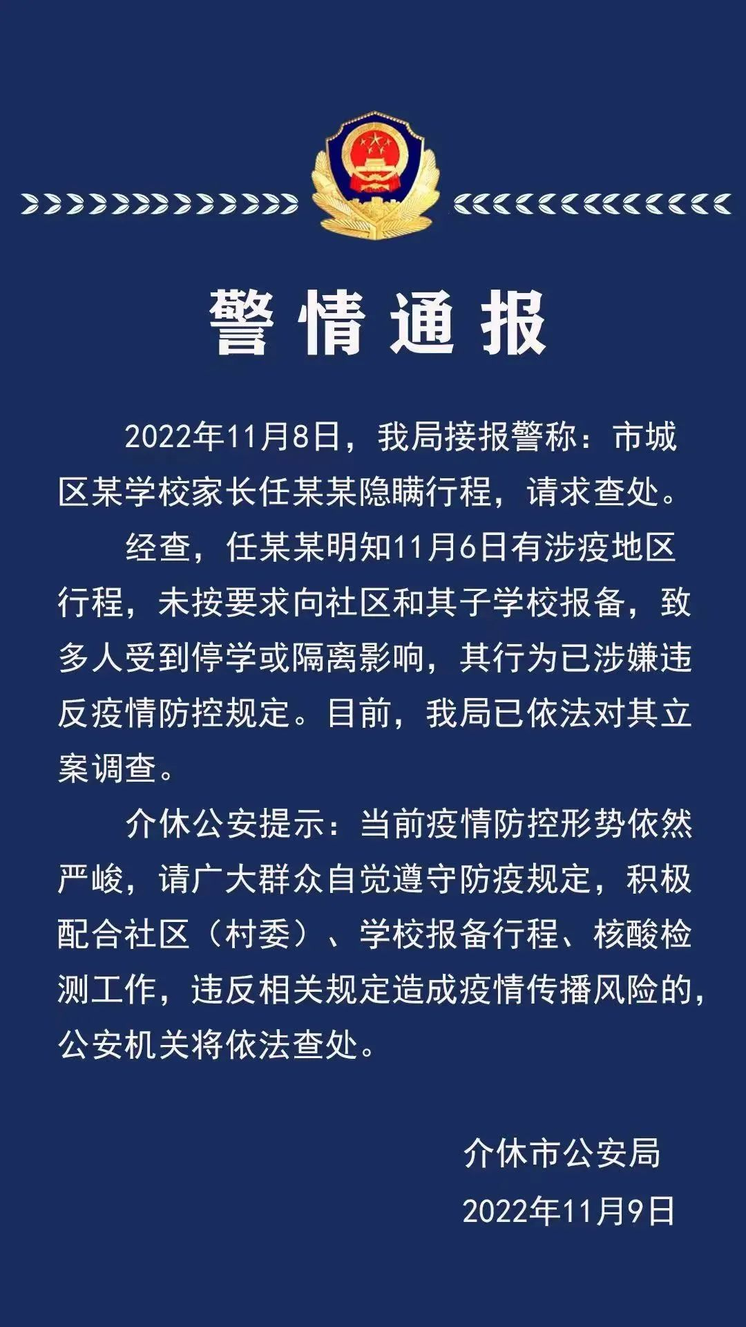 山西晋中介休市公安局11月9日发布警情通报称,该市城区某学校家长任某某隐瞒行程,致多人受到停学或隔离影响,已被立案调查。