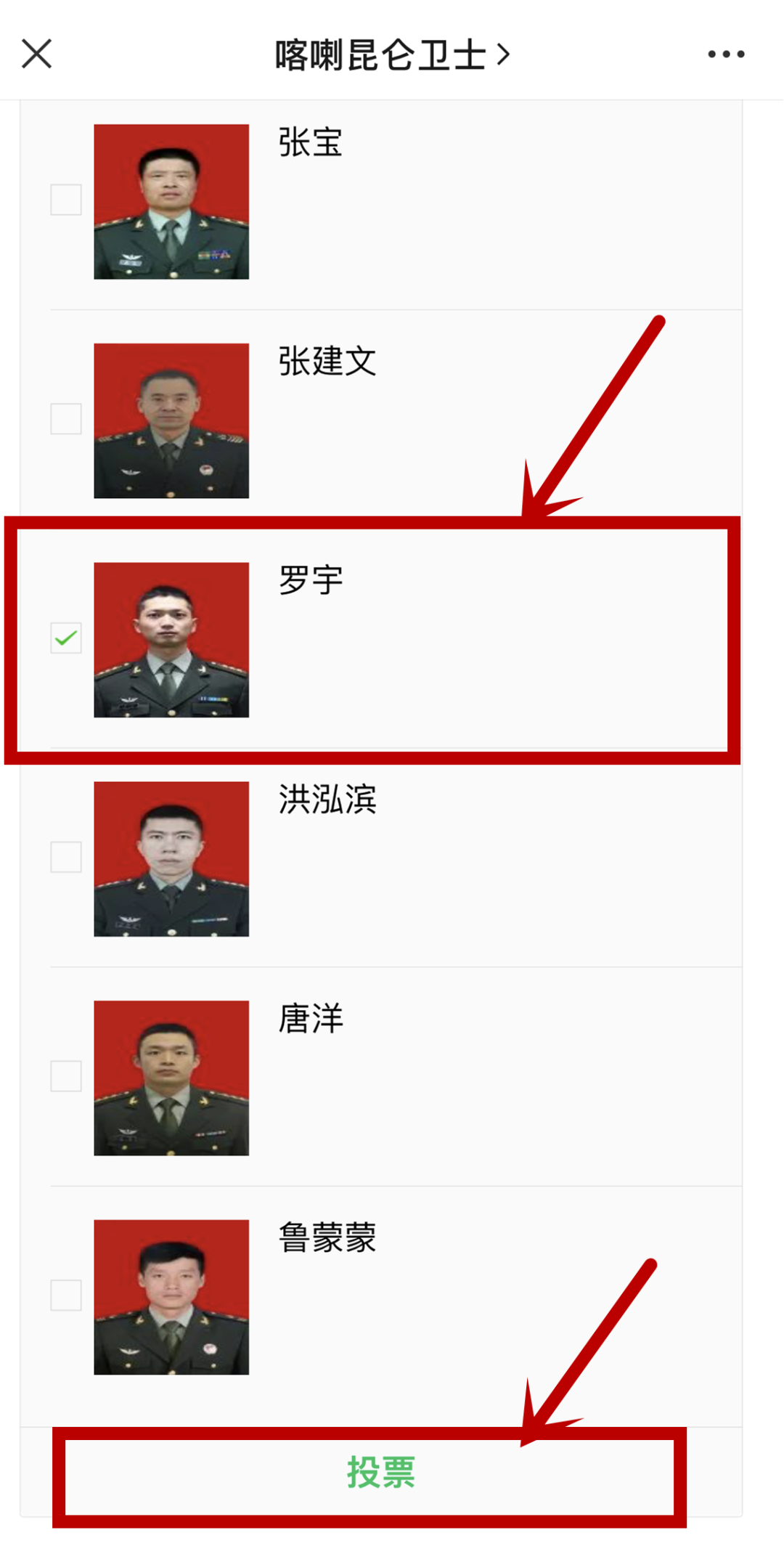 1、点击上图或者搜索“喀喇昆仑卫士”微信公众号进入投票页面。