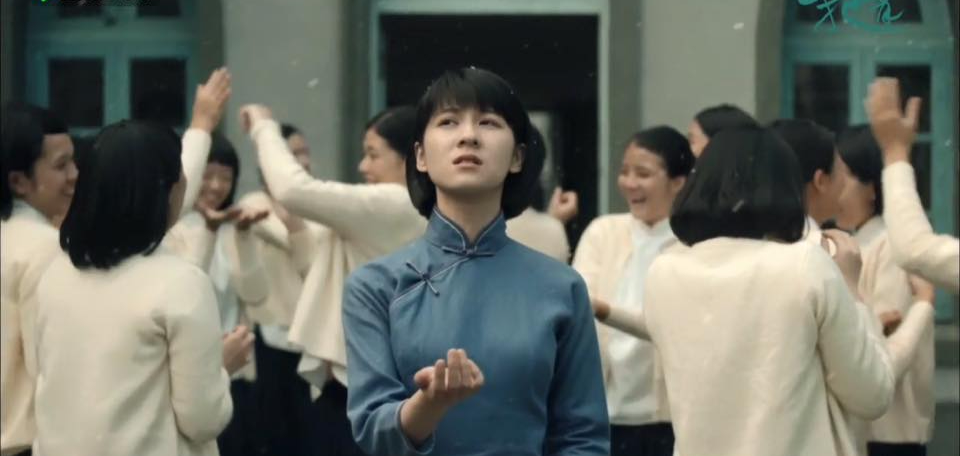 当朱青用轻浮的姿态打发走了师娘和副队娘,唱起压轴歌《蔷薇处处开》,才唱完“青春青春处处在”就唱不下去了,眉头深锁,久久望着师娘和副队娘离去的方向。