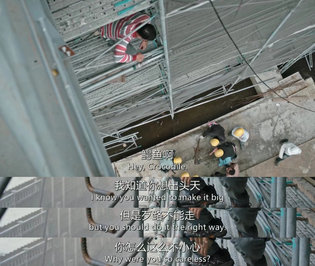 鳄鱼从天而降,莫名其妙地出现在工地里。当大家都在惊愕地看着这只鳄鱼时,阿祈已经从鳄鱼想到了鳄鱼皮。