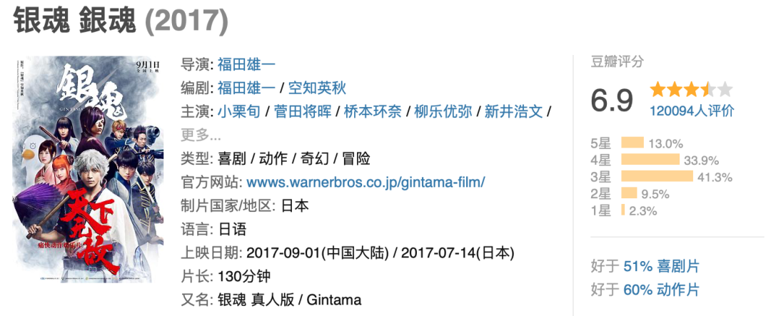 但即便如此,《银魂》真人版一二部,在豆瓣评分依然只有6.9分和7.3分。