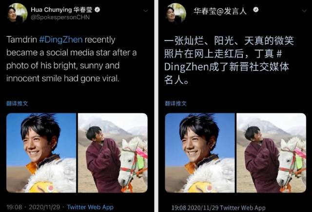 后来,丁真加入国企,又是一波热潮。再加上全国多地如西藏、青海省等发起抢人大战,这些话题助推汹涌流量。最后一阶段,张玺说,外交部发言人华春莹为他连发三条推特,“相当于(为丁真)定了个位”。
