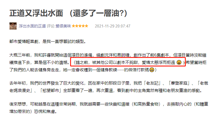 因为罕见的“女强男弱”配置,导演陈正道在豆瓣影评里透露,《爱很美味》此前曾被某影视公司拒绝的原因:太不现实,显得“悬浮”。