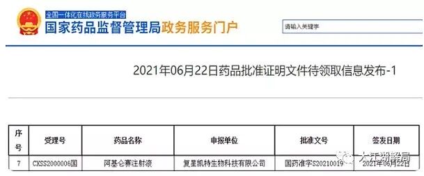 2021年6月22日,复星凯特旗下的阿基仑赛注射液,获得国家药监局审批。