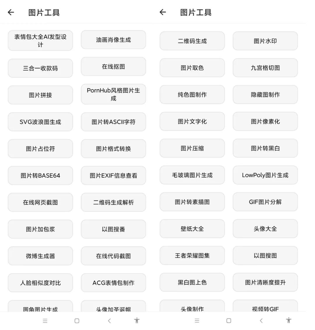 3、图片工具:这个工具想必大家会比较喜欢,你可以在这里搜索壁纸、图片、二维码解析生成、图片去水印、抖音风格文字生成、头像加口罩、图片无损放大和最近比较火的捏脸等等~