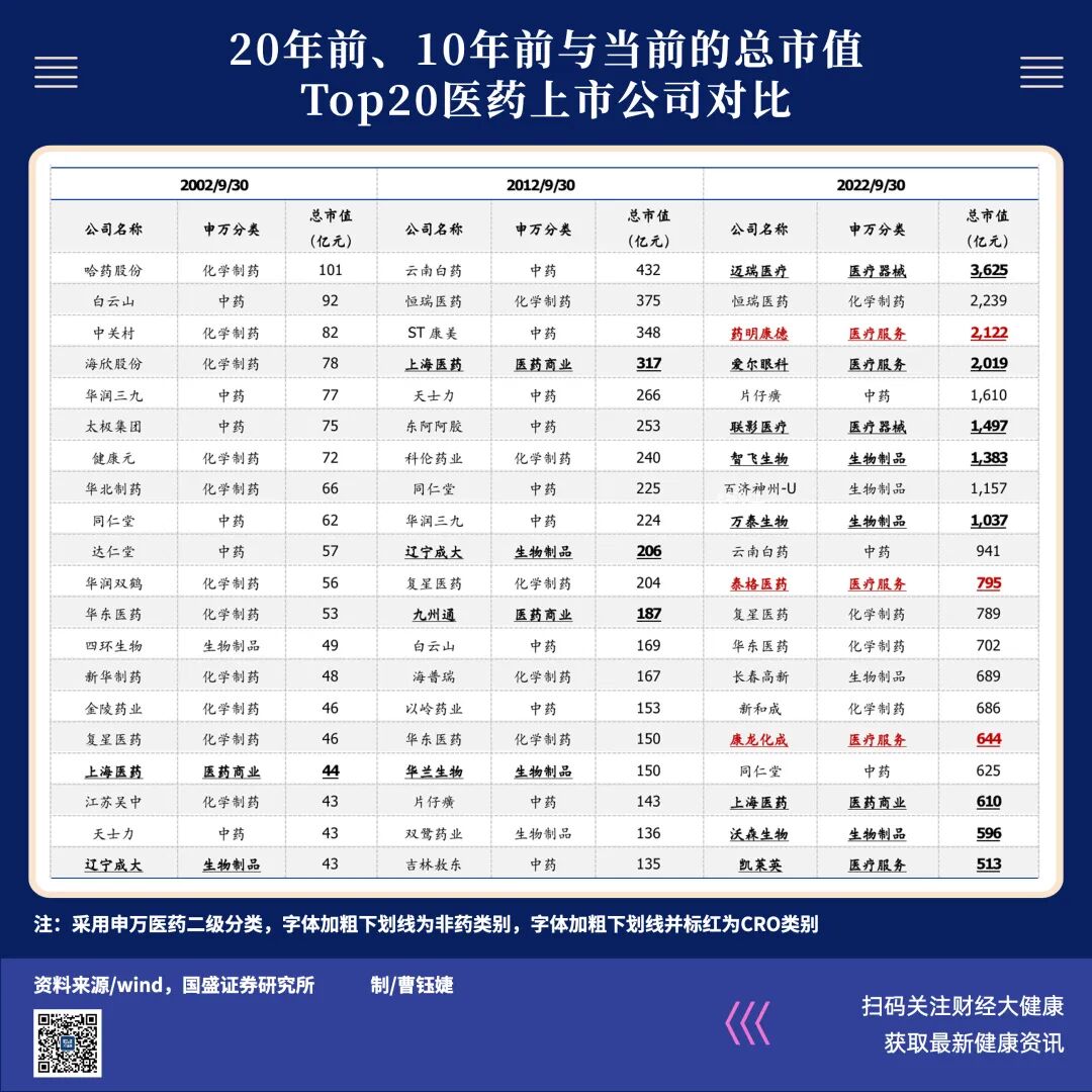 29年前,国内医药生物行业第一股“哈药股份”上市,拉开医药生物企业登陆资本市场的序幕。之后,医药生物上市公司的数量快速增加、规模持续扩张以及细分领域日渐丰富,截至2022年9月底,前20大市值医药生物公司中非药类占比过半,其中研发服务(CRO)公司独占三席。