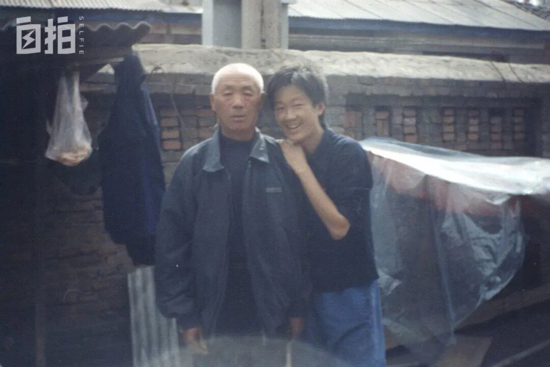 2001年在浴池锅炉房单间外和父亲合影。他蹬三轮收工后将买来的肉悬挂在遮蓬处,我高中时父亲已满头白发。